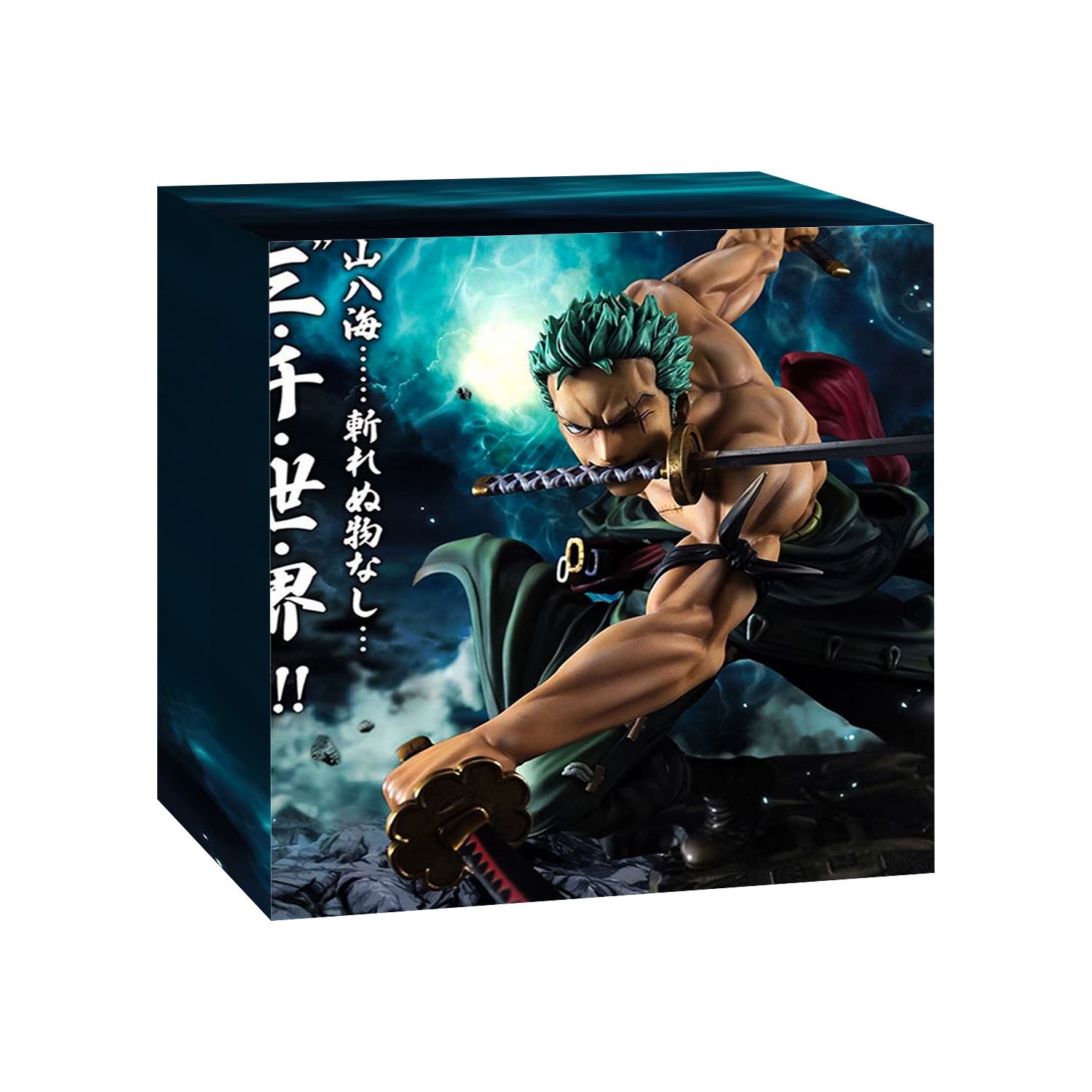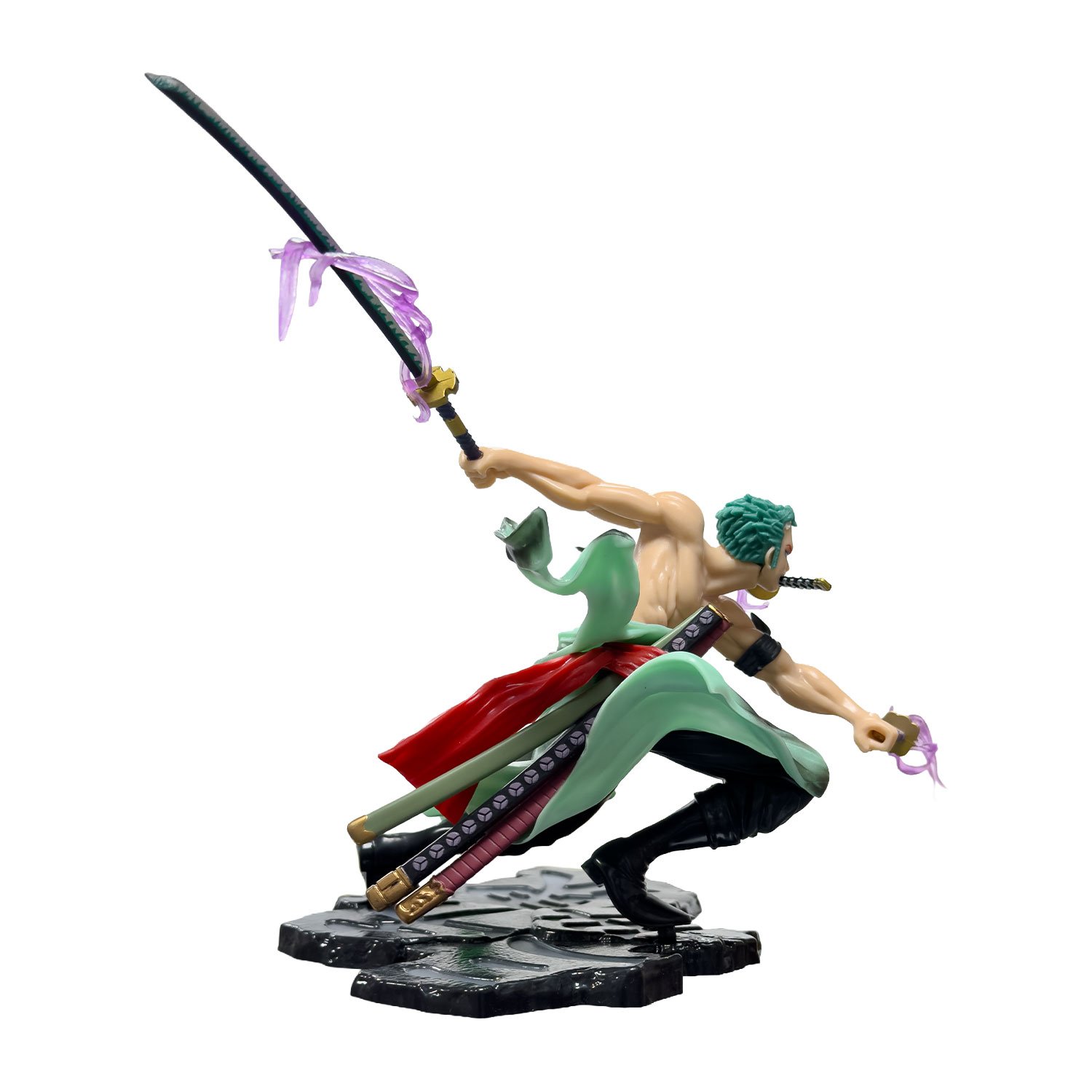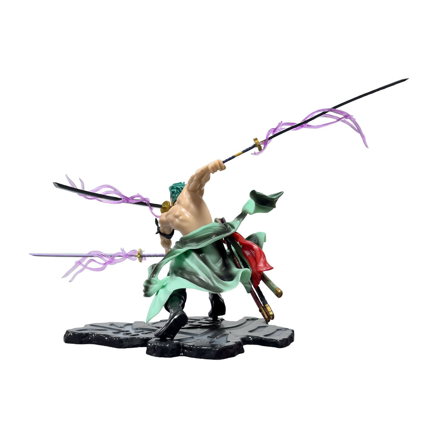 Fabricada con materiales de buena calidad, la Figura Zoro Roronoa Con Katanas es perfecta para exhibir en vitrinas, escritorios o estanterías, aportando un toque fuerte y épico a tu espacio.